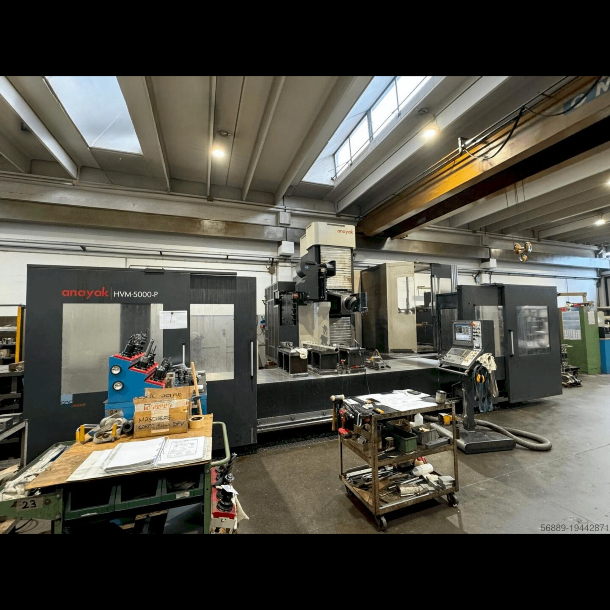 This 5-axis ANAYAK HVM 5000P CNC milling machine was manufactured in 2010. It features a large table surface of 4970 x 1200 mm, capable of handling loads up to 6000 Kg. Equipped with a multi-angular headstock and automatic angular positioning for precise control. The spindle supports speeds up to 6000 rpm, powered by a robust 28/38 kW motor. If you are looking to get high-quality milling capabilities, consider the ANAYAK HVM 5000P machine we have for sale. Contact us for more information.